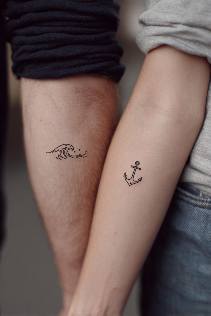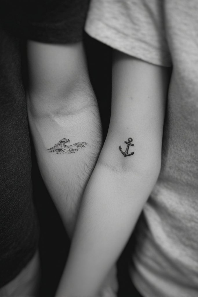 Combining a tiny wave with a small anchor creates a beautiful narrative about the balance between adventure and security in a relationship. One partner might wear the wave to represent the excitement, emotion, and constant movement of life, while the other carries the anchor to symbolize the grounding force and stability that keeps the relationship steady. Together, they represent a partnership that can navigate the wildest storms while remaining anchored in truth and loyalty. It is a perfect metaphor for couples who balance each other out, where one person encourages growth and exploration while the other provides a safe place to land. The contrast between the fluid lines of the water and the sturdy, geometric shape of the anchor makes for a visually interesting and highly meaningful set of tattoos.