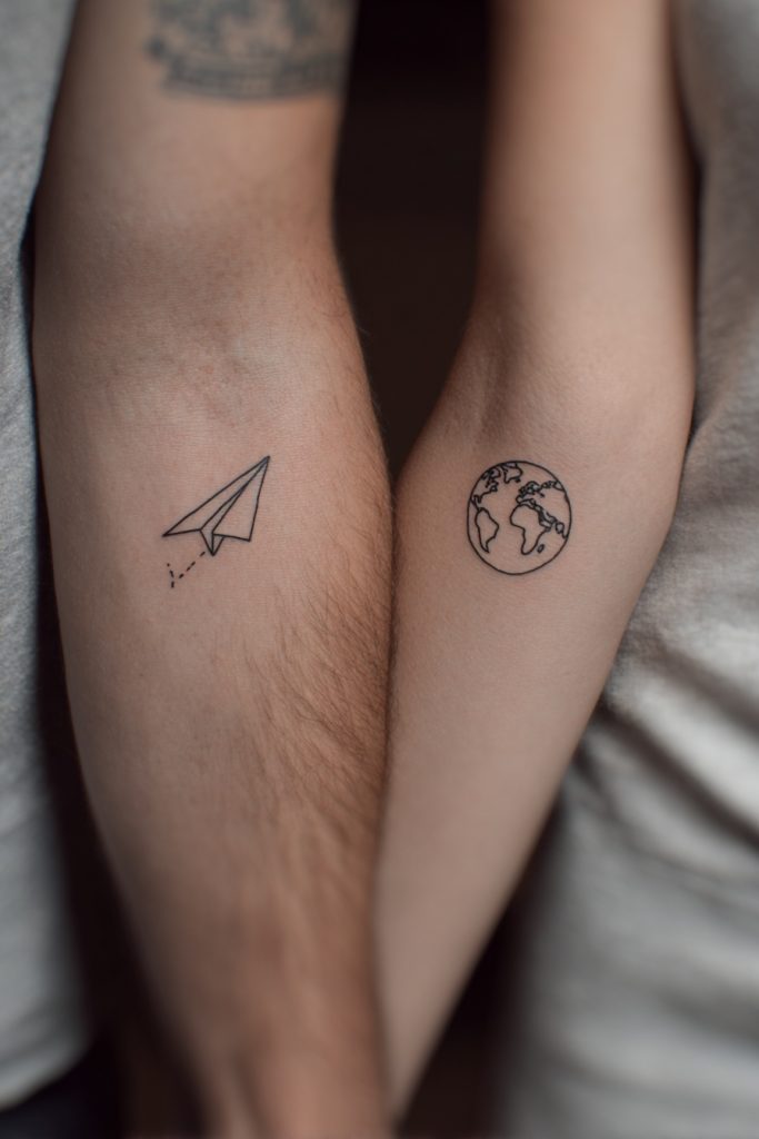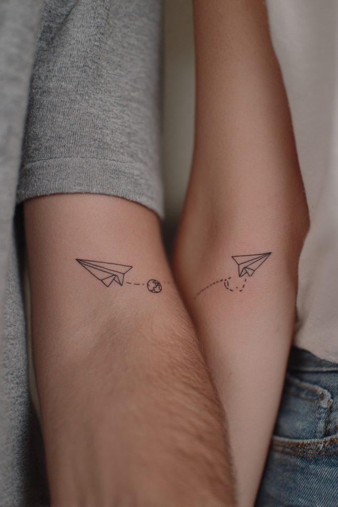 For the couple that views life as one long, shared adventure, the paper plane and a tiny globe or map outline are the ultimate symbols of wanderlust and connection. It represents the idea of traveling through the world together, whether that means literal international trips or simply navigating the unknown territories of a shared future. The paper plane signifies a lighthearted, spontaneous spirit, while the globe represents the vastness of the possibilities that lie ahead of you. This design is a celebration of the curiosity and excitement that keep a relationship fresh and vibrant. It is a reminder that no matter where you go or what you see, you are doing it with your favorite co-pilot by your side. The minimalist aesthetic keeps these designs looking like fine art rather than a literal illustration, fitting perfectly on the forearm or the shoulder.