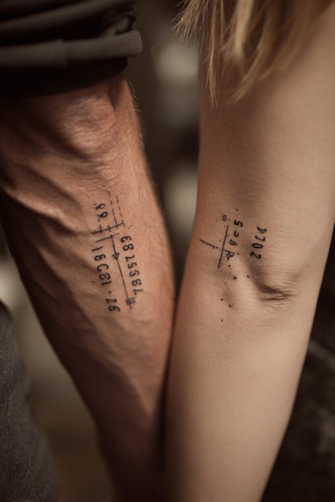 Using latitude and longitude coordinates is a sophisticated and private way to mark a location that changed your relationship forever. It could be the spot where you first met, the place where you got engaged, or the coordinates of your first shared home. To anyone else, the numbers appear as an abstract, modern design, but to the two of you, they act as a permanent map to a cherished memory. This tattoo offers a high level of privacy while maintaining a clean, linear look that is very popular in contemporary minimalist art. It is a way to stay anchored to a specific point in time and space, acknowledging that certain places are sacred because of the memories you created there together. Tucked away on a ribcage or the inner arm, these numbers serve as a silent anchor for your shared history.