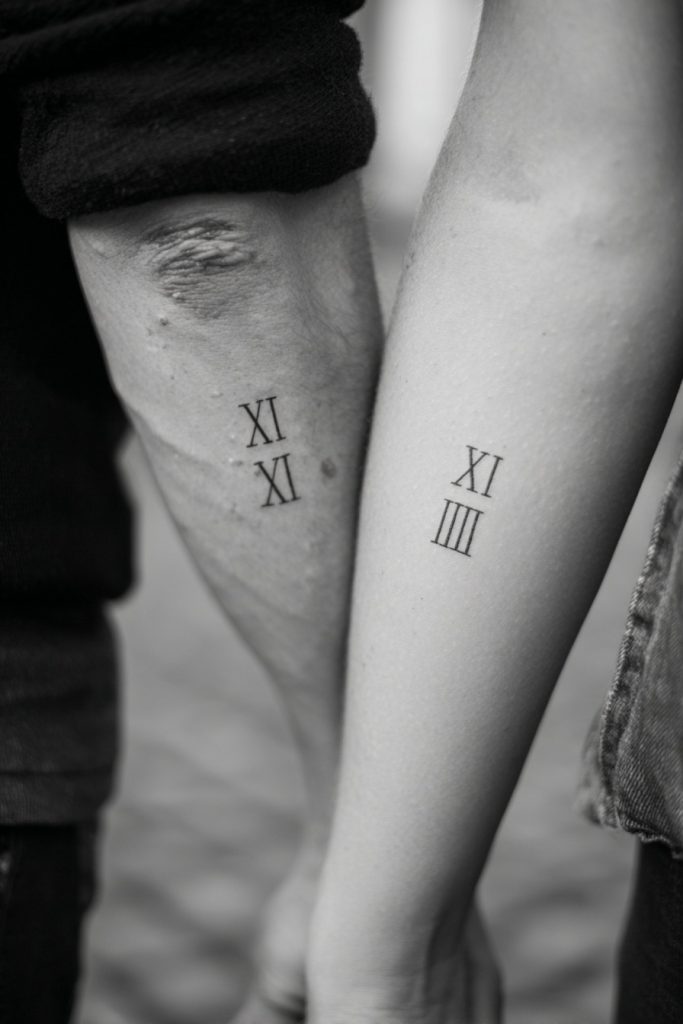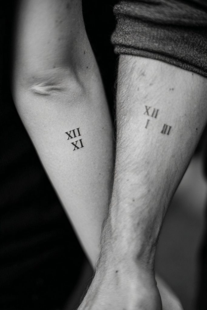 Roman numerals offer a timeless and architectural way to commemorate a significant date in your relationship, such as an anniversary or the birth of a child. The blocky, linear nature of the numerals creates a clean and sophisticated look that feels more like a design element than a traditional date. It is a way to honor the passage of time and the milestones you have reached as a couple, turning a specific moment into a permanent part of your identity. This style is incredibly versatile, looking just as good in a bold, dark font as it does in a very fine, light needle. Many couples choose to place these numbers in the same location to create a sense of symmetry and shared history. It is a classic choice that remains stylish regardless of changing trends, serving as a permanent record of your most important ‘days.’