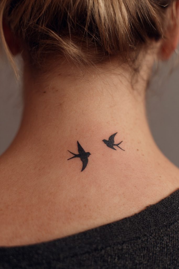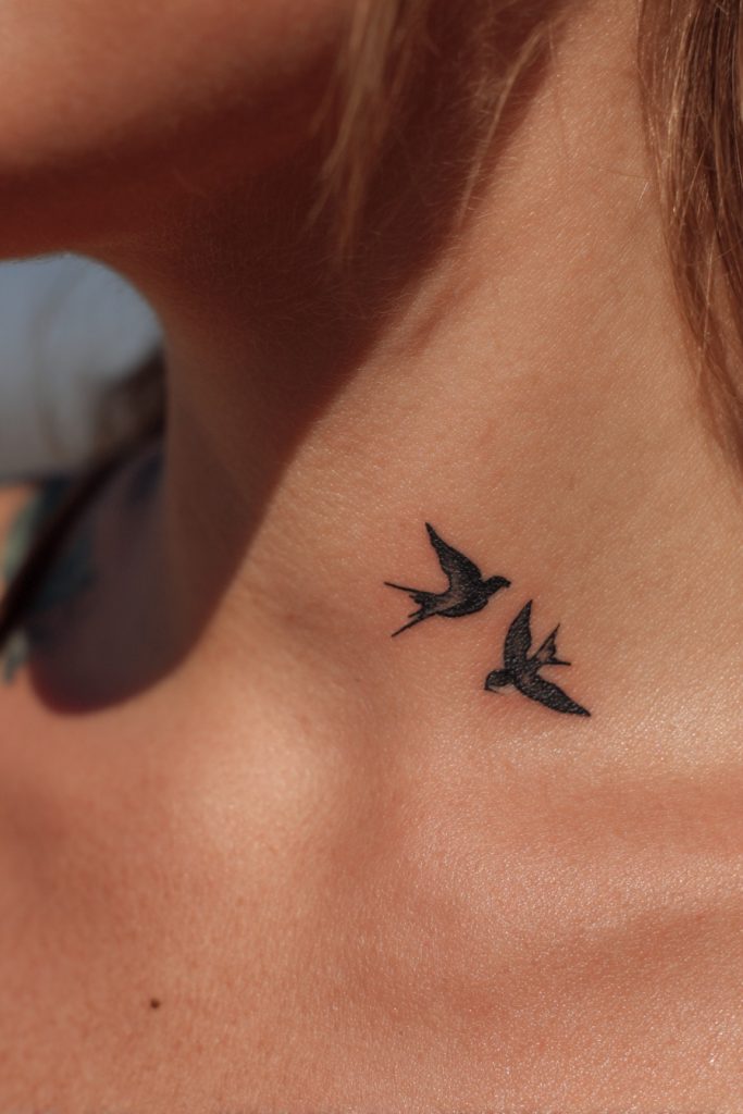 The image of two birds flying together is a beautiful representation of freedom, partnership, and the idea of building a life, or a nest, side by side. It symbolizes the ability to soar to great heights while always remaining in each other’s company. This design is often associated with the idea of ‘lovebirds’ and the natural, effortless way that certain people belong together. Whether you choose two small swallows for loyalty or two simple silhouettes of birds on a wire, the meaning remains one of shared trajectory and mutual support. It is a hopeful and uplifting design that celebrates the joy of finding someone who makes your world feel more expansive and full of light. Placed on the collarbone or the upper back, these tiny birds act as a permanent symbol of the heights you can reach when you fly together.