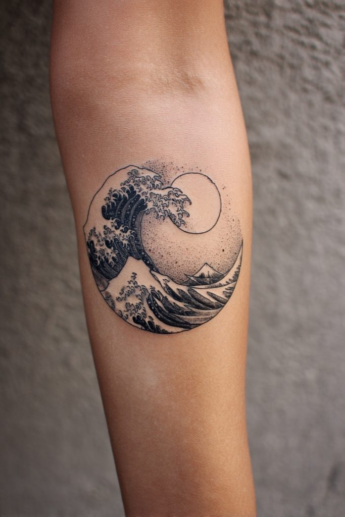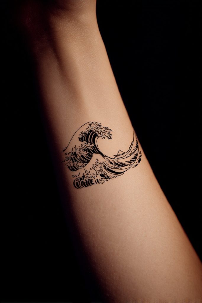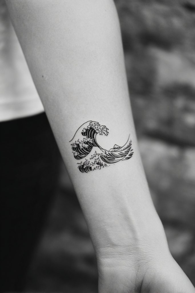 Inspired by the iconic Japanese woodblock print, a minimalist wave tattoo captures the immense power of the ocean through clean, deliberate linework. This design often focuses on the crest of the wave, utilizing fine lines to suggest the churning foam and the looming weight of the water. It is a perfect choice for those who appreciate the balance between destructive force and artistic grace. Because the shape is so fluid, it can be easily wrapped around a wrist or positioned along the curve of a shoulder, making it feel like a natural extension of your anatomy. The simplicity of this style ensures that the tattoo remains timeless, evoking the Great Wave of Kanagawa without needing excessive shading or color. It serves as a permanent reminder that even in the face of overwhelming odds, there is a profound and moving beauty to be found in the struggle.