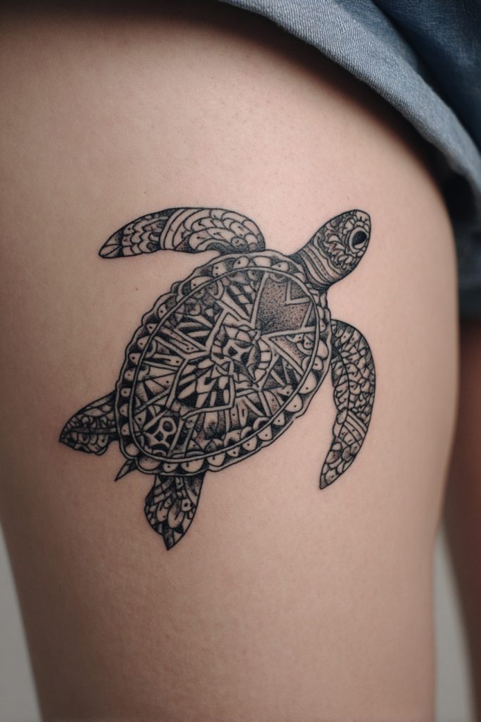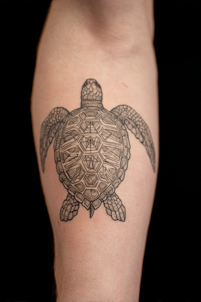 The sea turtle is a universal symbol of endurance, navigation, and the long journey of life. When combined with geometric patterns, this ancient creature takes on a modern and highly structured appearance that highlights the incredible architecture of its shell. The use of sacred geometry, such as mandalas or crisp triangular grids, within the turtle’s body creates a fascinating contrast between the organic shape of the animal and the precision of the linework. This style often represents the idea that there is a cosmic order to our long travels and that we are always exactly where we need to be. It is an excellent choice for a larger piece on the back or thigh, where the complexity of the design can truly shine. A geometric turtle is a mark of a person who values tradition but looks at the world through a lens of contemporary logic and spiritual interconnectedness.