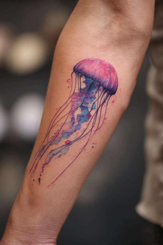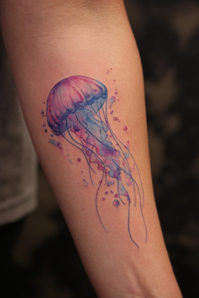 Jellyfish are the ghosts of the ocean, drifting through the dark water with a grace that is both beautiful and slightly dangerous. A watercolor style is perhaps the best way to capture their ethereal nature, using soft washes of pink, purple, and blue to mimic the way they glow in the deep. The long, trailing tentacles of a jellyfish offer a great deal of movement for a tattoo, allowing the artist to flow the design down an arm or leg in a way that feels organic and alive. This tattoo often symbolizes a state of flow and the ability to move with the currents of life rather than fighting against them. Because there are no harsh outlines in a true watercolor piece, the jellyfish appears to be floating right on the skin, creating a dreamlike and artistic effect that is sure to draw the eye and spark a conversation about the mysteries of the abyss.