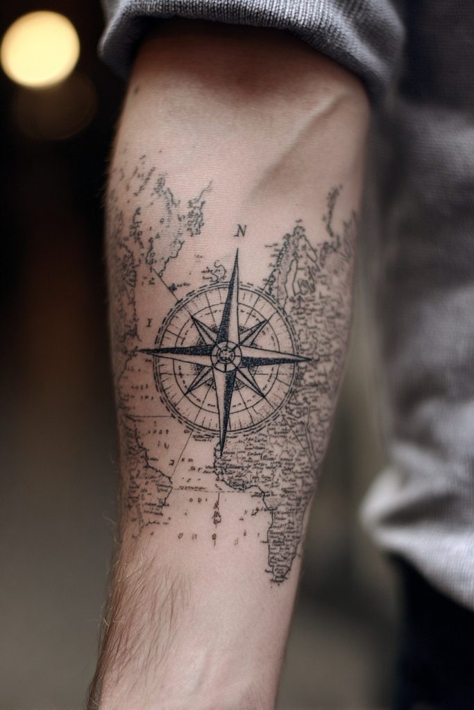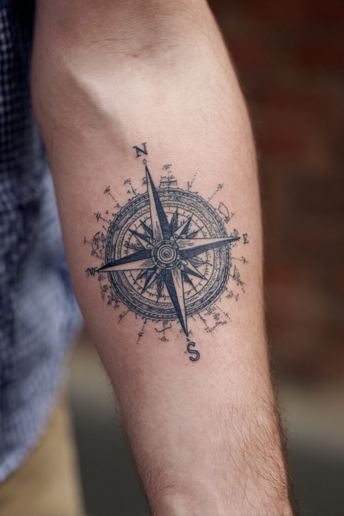 A compass rose is the ultimate symbol for the traveler, representing guidance, direction, and the thrill of exploration. When paired with a vintage nautical map or a set of coordinates, this tattoo becomes a deeply personal artifact that tells the story of where you have been and where you are going. The design often involves intricate linework and a sense of old-world craftsmanship, reminiscent of the tools used by early explorers to navigate the unknown. This piece is perfect for those who feel a constant sense of wanderlust and who view life as a series of journeys across uncharted waters. It serves as a reminder to trust your internal navigation and to remain curious about what lies beyond the horizon. Whether it is a small, hidden compass or a large, detailed back piece, this design is a tribute to the spirit of discovery that defines the human experience.