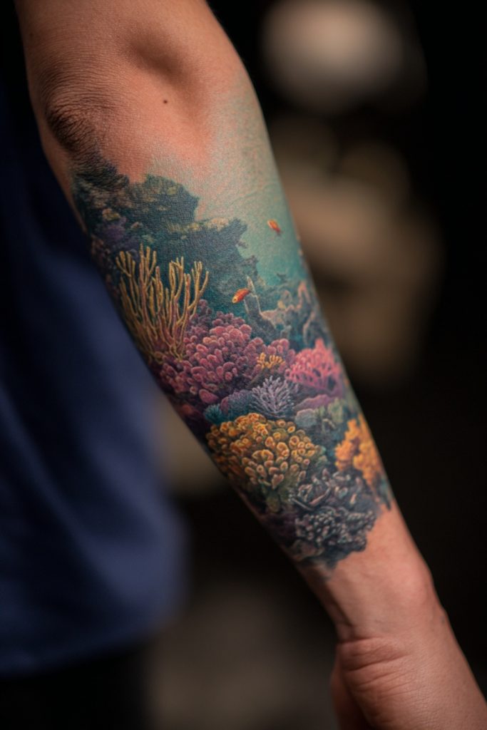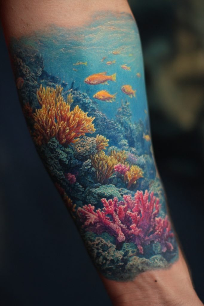 If you want to bring the vibrant colors and incredible biodiversity of the ocean to your skin, a hyper-realistic coral reef is a breathtaking option. These tattoos are essentially underwater landscapes, filled with textured corals, darting fish, and the dappled light of the sun filtering through the water. This style requires a highly skilled artist who can manage complex color transitions and high levels of detail, but the result is a stunningly immersive piece of art. A coral reef tattoo often symbolizes life, growth, and the delicate balance of nature. It is a celebration of the hidden worlds that exist beneath the surface and a commitment to appreciating the complexity of the living world. This is a bold and energetic choice that feels like a window into another dimension, providing a constant source of inspiration and visual wonder for the wearer and everyone who sees it.
