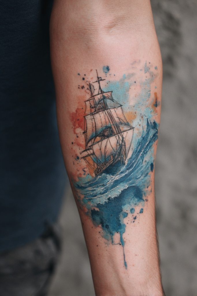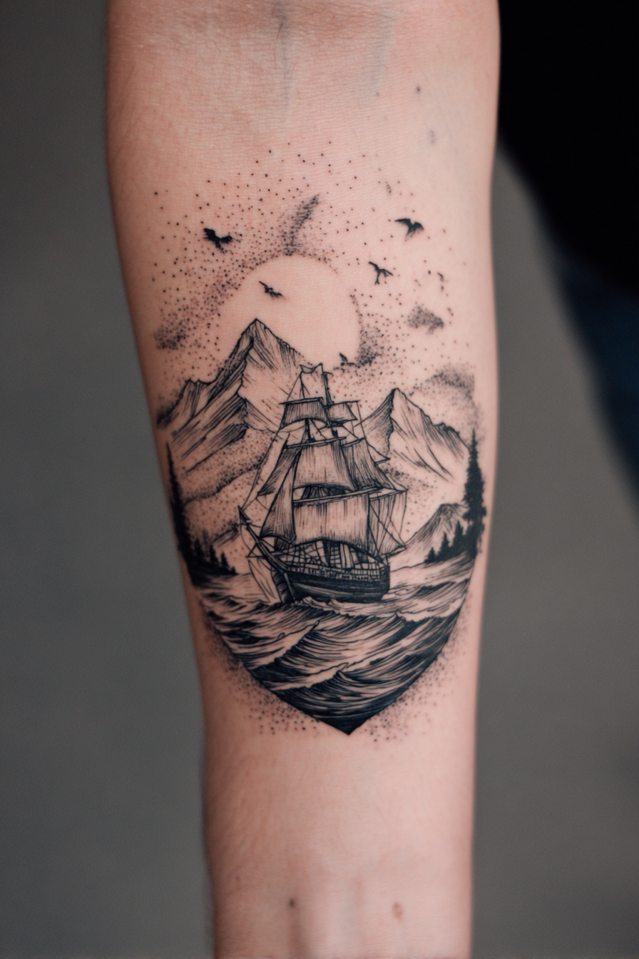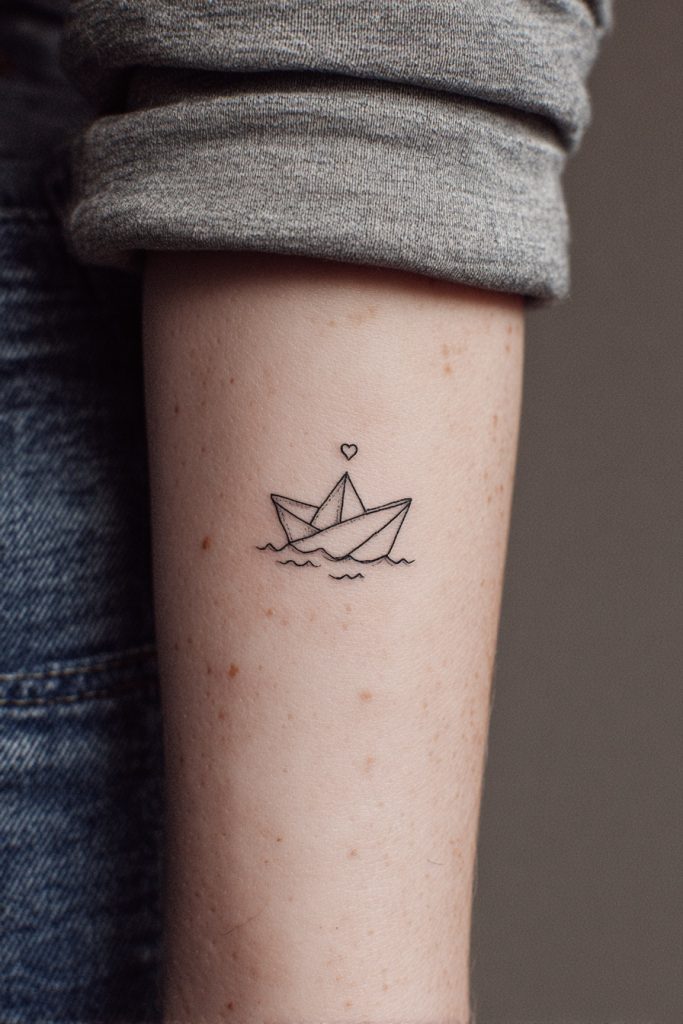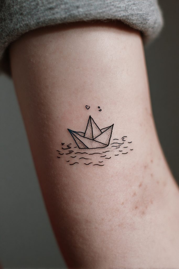 A paper boat floating on a few simple ripples is a charming and deeply nostalgic tattoo idea that speaks to the vulnerability of our journeys. It represents the idea that even though we are small and fragile in the face of the massive ocean, we still have the courage to set sail and see where the current takes us. This design is often done in a minimalist or illustrative style, sometimes with a tiny heart or a name on the sail to add a personal touch. It is a wonderful metaphor for childhood innocence, the start of a new adventure, or the simple act of letting go and trusting the process. The paper boat is a gentle reminder that you don’t need a massive ship to explore the world; you just need the willingness to embark and the resilience to stay afloat through the gentle waves of daily life.