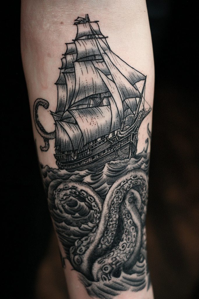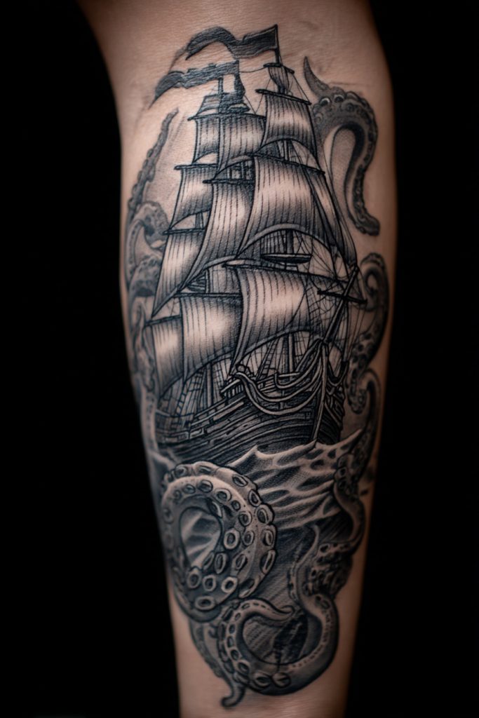 For those who love the darker and more dramatic side of maritime myth, a tattoo of the Kraken is the ultimate choice. This legendary sea monster, capable of dragging entire ships down to the depths, represents the terrifying and uncontrollable power of the ocean. In a tattoo, the Kraken is often shown with its massive tentacles wrapping around an old sailing vessel, a scene of epic conflict that allows for incredible detail and a sense of motion. This design is usually done as a large-scale piece, such as a full sleeve or a back mural, to truly capture the sense of scale and drama. The Kraken represents the chaos of the deep and the fears that we must face and overcome. It is a bold and intense choice for someone who isn’t afraid to acknowledge the shadows and who respects the ocean as a force that can never be truly tamed.