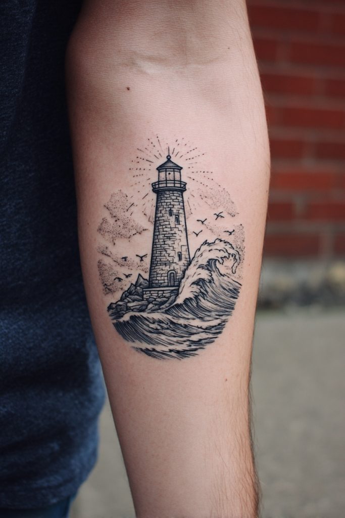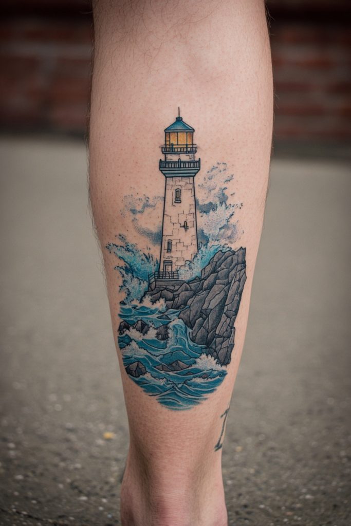 The lighthouse is a classic symbol of safety, guidance, and the enduring light that leads us through the darkness. Standing firm against the crashing waves and the howling wind, it represents the strength of the human spirit and the importance of having a beacon to follow when the path forward is unclear. A lighthouse tattoo is often framed by rocky cliffs and churning water, creating a complete scene that tells a story of resilience and protection. Many people choose this design to honor a person who has been a guiding light in their life, or as a personal promise to remain steadfast in their own values. It is a hopeful and sturdy piece of ink that offers a sense of comfort and direction, reminding the wearer that no matter how stormy the sea becomes, there is always a way back to the safety of the shore.