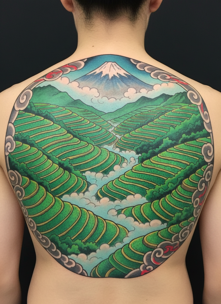 Inspired by the stunning landscapes of Southeast Asia, a rice terrace tattoo is a unique and geometrically interesting way to represent the intersection of nature and human ingenuity. The curved, stepped layers of the green fields create a rhythmic pattern that flows beautifully with the contours of the body. These scenes often include a touch of mist in the valleys or a distant mountain peak, adding a sense of scale and atmosphere. It is a symbol of growth, sustenance, and the incredible patience required to cultivate the earth. The bright, emerald greens used in these designs are eye-catching and vibrant, making it a standout piece of body art. This scene is a great choice for someone who values the beauty of traditional landscapes and the quiet, persistent effort it takes to create something truly magnificent.