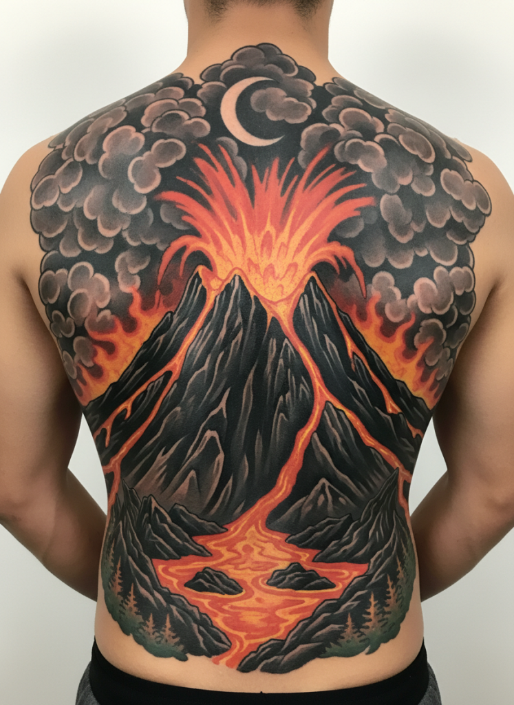 For a nature scene that is anything but peaceful, a volcanic eruption captures the terrifying and creative power of the earth. This design features a dark mountain peak with a glowing plume of orange and red lava flowing down its sides, set against a sky filled with thick gray ash. It represents the idea that destruction and creation are two sides of the same coin, as volcanic soil is some of the most fertile on earth. This is a bold and intense tattoo, perfect for someone who has gone through a transformative fire in their own life and emerged stronger for it. The high contrast between the black rock and the glowing lava creates a visual impact that is hard to ignore, making it a powerful statement about the raw, untamed energy that lies just beneath the surface of our world.