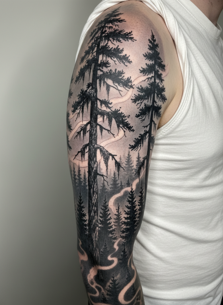 For those who prefer a more somber and mysterious aesthetic, the misty evergreen forests of the Pacific Northwest provide endless inspiration. This style often utilizes a black and gray palette to capture the various depths of the tree line, with the tallest pines fading into a soft, hazy background. The use of negative space is crucial here, as it allows the skin to act as the mist weaving between the branches. This creates a hauntingly beautiful scene that feels quiet and contemplative, perfect for a large back piece or a full sleeve. It captures the feeling of a cold morning hike where the world feels private and untouched. The level of detail in the individual needles and the mossy textures can turn a simple forest into a complex narrative about growth and the cycle of life in the shadows.