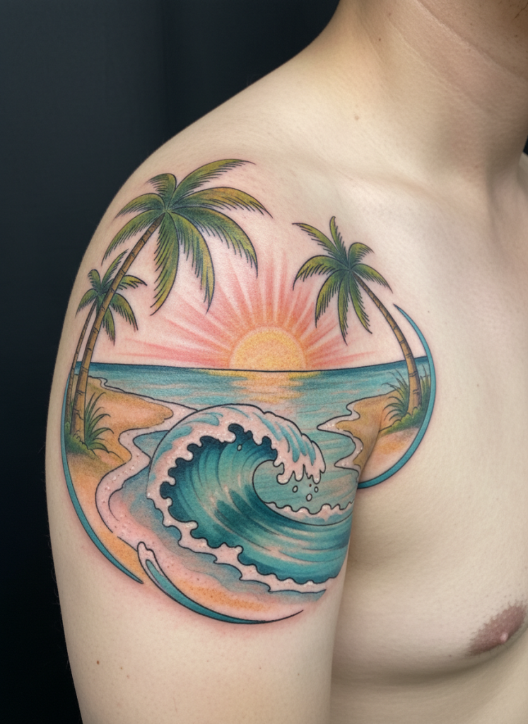 If your heart belongs to the ocean, a tropical shoreline scene can bring the warmth of a permanent summer to your skin. This design often features the intersection of white sands, leaning palm trees, and the rhythmic curl of a turquoise wave. The challenge and the beauty of this scene lie in the transition between the clear water and the horizon, where the colors of a setting sun can be used to add a brilliant pop of pink and gold. This type of tattoo is often chosen by those who view the beach as their sanctuary and want to remember the feeling of the salt air and the warmth of the sun. It is a cheerful and vibrant scene that balances the organic curves of the palm fronds with the vast, open perspective of the sea, making it a stunning choice for a shoulder or a thigh.