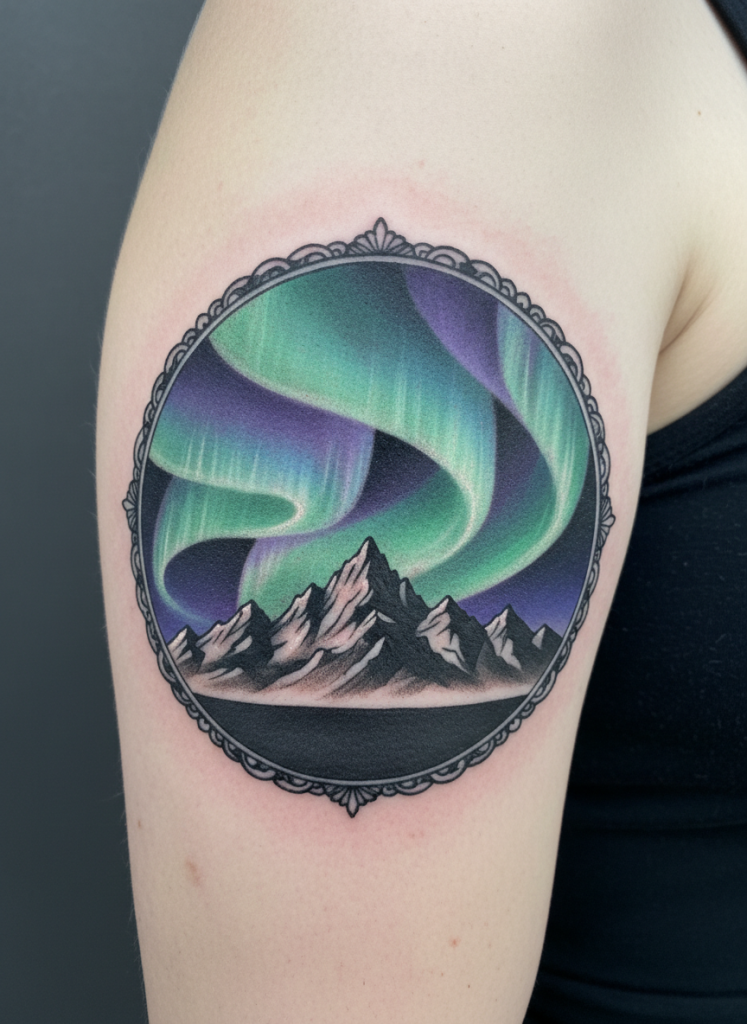 Capturing the Aurora Borealis in ink is a feat of artistic skill that results in one of the most mesmerizing nature scenes possible. This tattoo typically features a dark, silhouetted mountain range or a snowy forest at the bottom to provide contrast for the flowing, neon ribbons of green, purple, and blue in the sky above. Because the lights are fluid and ethereal, the artist can use a watercolor technique or soft blending to make the colors appear as though they are actually shimmering on the skin. It represents the magic and the mystery of the natural world, serving as a reminder that there are things in this universe that are far beyond our understanding. This scene is particularly effective as a large-scale piece where the colors have enough room to flow and blend without feeling crowded or muddy.