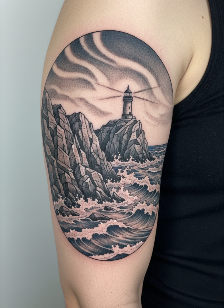 A coastline scene provides a dramatic contrast between the solid, unyielding strength of the cliffs and the constant, fluid motion of the ocean. These tattoos often feature jagged rocks, a lighthouse perched on a distant point, and the white spray of waves crashing against the shore. This imagery is deeply symbolic of staying steady in the midst of a storm and finding your way through difficult times. The maritime theme adds a touch of adventure and history to the nature scene, making it a favorite for those with a connection to the sea or a love for travel. The artist can use fine line work to capture the texture of the rocks and broader, softer shading for the water, creating a dynamic piece of art that feels as though you can almost hear the roar of the surf.
