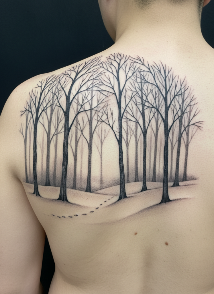 A winter forest scene is a study in minimalism, silence, and the stark beauty of the cold. By using mostly black and gray with plenty of white space to represent the snow, the artist can create a scene that feels incredibly crisp and still. The bare branches of the trees create intricate, lace-like patterns against the sky, while a single set of animal tracks in the snow can add a subtle touch of storytelling. This tattoo represents the importance of rest, reflection, and the quiet strength needed to endure the lean times. It is a sophisticated and understated design that appeals to those who find the winter to be a time of internal growth and peace. The lack of color only serves to highlight the complex textures of the bark and the soft, pillowy shapes of the snow-covered ground.
