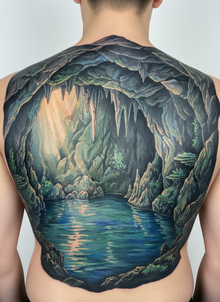 A grotto or cave scene is a beautiful way to represent the hidden, internal parts of ourselves that are only revealed to those who take the time to look deeper. These tattoos often feature stalactites hanging from the ceiling and a clear, underground pool that reflects a small amount of light coming from the cave entrance. The use of deep blues, teals, and dark grays creates a sense of enclosure and mystery that is very intimate. It is a sanctuary hidden away from the rest of the world, representing the depth of our own emotions and the secret places where we find our greatest strength. The artist can play with the way light hits the wet stone surfaces, creating a sparkling, magical effect that makes the scene feel like something out of a fairy tale.