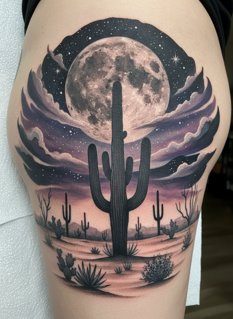 While daytime desert scenes are about heat and color, a desert night scene is about mystery, silence, and the stark beauty of the shadows. This design often features the iconic silhouette of a Saguaro cactus against a massive, low-hanging moon and a sky filled with an impossible number of stars. The color palette shifts to cool purples, deep indigos, and silvery whites, creating a look that is both sophisticated and a bit surreal. It captures the unique atmosphere of the high desert, where the air is cool and the world feels expansive and ancient. This scene is a great choice for those who are drawn to the quiet and the contemplative, serving as a reminder that beauty can be found even in the most arid and challenging environments. It is a testament to the resilience of life under the stars.