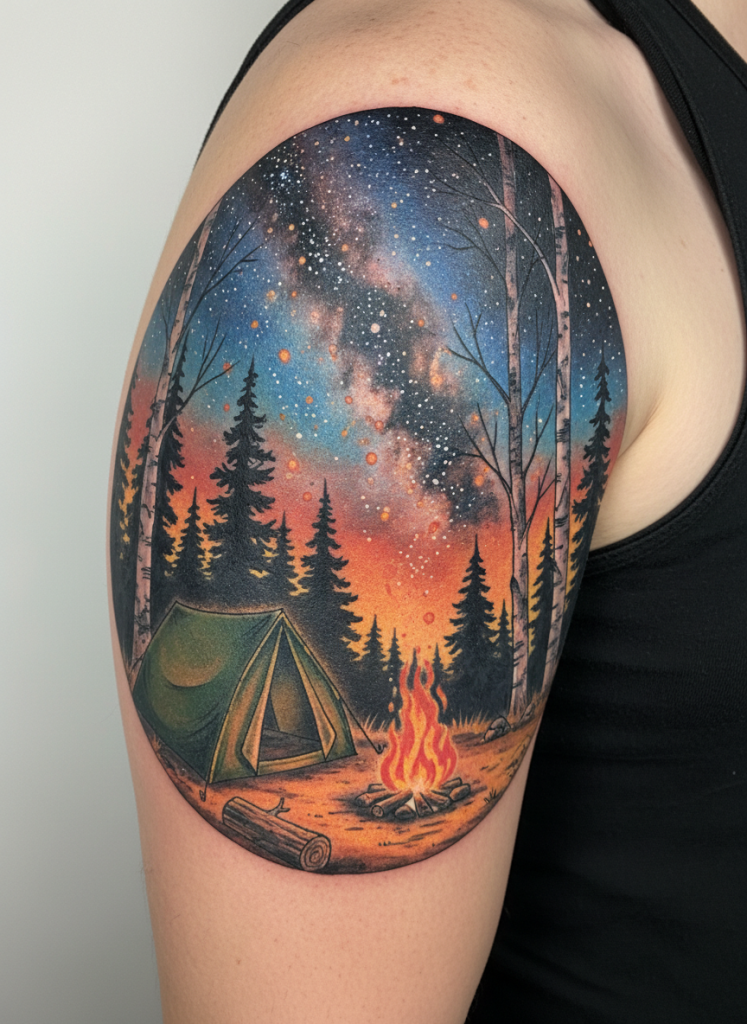 A campsite scene is less about the grand majesty of a mountain and more about the intimate connection between humans and the wild. This design often features a small tent, a crackling campfire with orange embers rising into the air, and a backdrop of tall trees under a vast, starry sky. It evokes feelings of nostalgia, adventure, and the simple joy of sitting in the dark with nothing but the sound of the woods. The fire provides a focal point of warm light that contrasts beautifully with the deep blues and blacks of the night. For many, this tattoo is a tribute to a specific memory or a lifestyle dedicated to exploration and self-reliance. It is a cozy, storytelling piece that reminds the wearer that even in the vastness of the wilderness, we can find a sense of home and belonging.