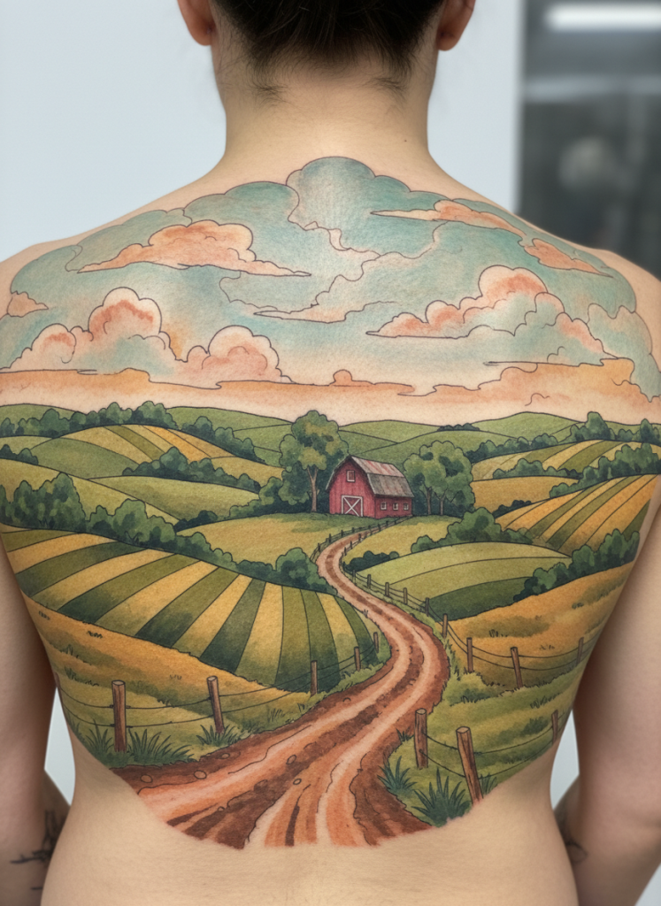 For those who find their solace in the countryside, a scene of rolling green hills and patchwork fields offers a sense of pastoral peace and simplicity. This design often includes a winding dirt road, a distant barn, or a row of fence posts, suggesting a human presence that is in harmony with the land. The use of various shades of green and yellow creates a soft, textured look that is very grounding and soothing to look at. It is a celebration of the fertile earth and the slow, steady pace of rural life. This type of scene is perfect for a wide placement, like across the upper back or the chest, where the horizon line can stretch out and give the tattoo a sense of limitless space. It is a beautiful tribute to the places where the sky feels big and the world feels manageable.