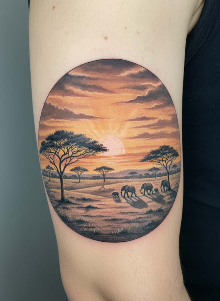 The savannah landscape is defined by its iconic acacia trees and the sheer vastness of its horizons, creating a scene that feels both ancient and full of potential. These tattoos often use a warm, golden-hour palette to capture the feeling of the sun setting over the plains. The silhouette of a distant herd of elephants or a lone giraffe can add a sense of life and scale to the wide-open space. It is a symbol of freedom, the wild heart of the earth, and the long history of our own species. This scene works beautifully as a wrap-around piece on the leg or arm, where the long, horizontal lines of the plains can stretch out and give the wearer a sense of the infinite. It is a tribute to the raw beauty of the open world and the enduring spirit of the wild.