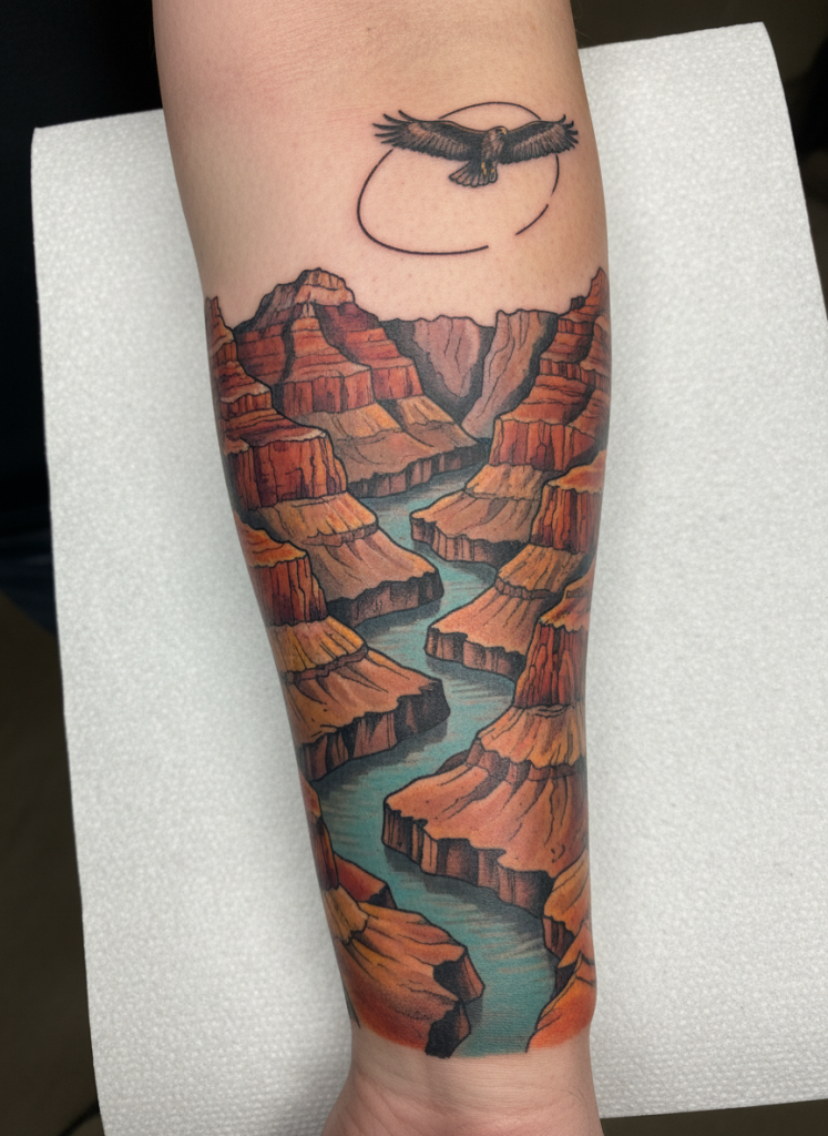 A desert canyon scene is a masterclass in the use of color and shadow, offering a dramatic landscape that feels both ancient and vibrant. These tattoos often focus on the layered rock formations of places like the Grand Canyon or Zion, where the sun creates deep oranges and fiery reds against the stark shadows of the crevices. Because of the linear nature of the rock layers, this design works exceptionally well as a wrap-around piece on a forearm or a lower leg, creating a sense of movement as you turn your limb. The inclusion of a small river at the bottom or a soaring hawk in the sky adds a sense of life to the otherwise silent stone. It is a perfect choice for those who find beauty in the rugged and the raw, celebrating the slow and steady power of erosion and time.