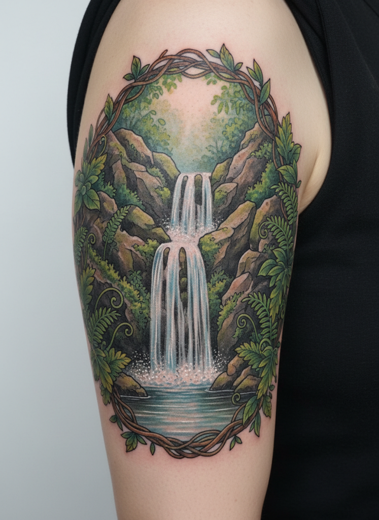 Waterfall scenes are all about movement and the sensory experience of nature, capturing the power and the grace of falling water. These designs often incorporate lush, green ferns and mossy rocks to frame the white, frothing water as it plunges into a pool below. The challenge for the artist is to capture the translucency of the water and the spray of the mist, often using fine white highlights to create a sense of glisten and spray. This scene symbolizes the constant flow of life and the idea of being cleansed or refreshed by the natural world. It is a vertical design that looks incredible on the side of the ribs or down the back of a calf, following the natural downward flow of the water. It represents a hidden sanctuary, a place of power and peace that remains untouched by the outside world.