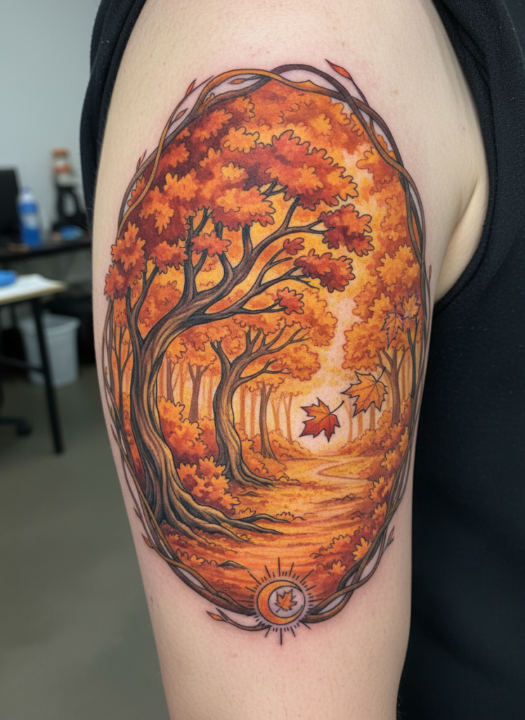 Autumn is a season of transition, and a tattoo featuring a grove of trees in full fall color is a stunning way to represent change and the beauty of letting go. The palette of deep ambers, burnt oranges, and bright yellows creates a warm and inviting scene that stands out beautifully on any skin tone. Many people choose to include a few falling leaves caught in the breeze, adding a sense of time and movement to the static image. This scene is often chosen to mark a significant life change, honoring the idea that there is grace and beauty in the ending of one chapter as the next prepares to begin. Whether it is a single maple tree or a winding path through a forest of oaks, the autumnal scene is a vibrant celebration of the earth’s natural cycles and the fleeting nature of perfection.