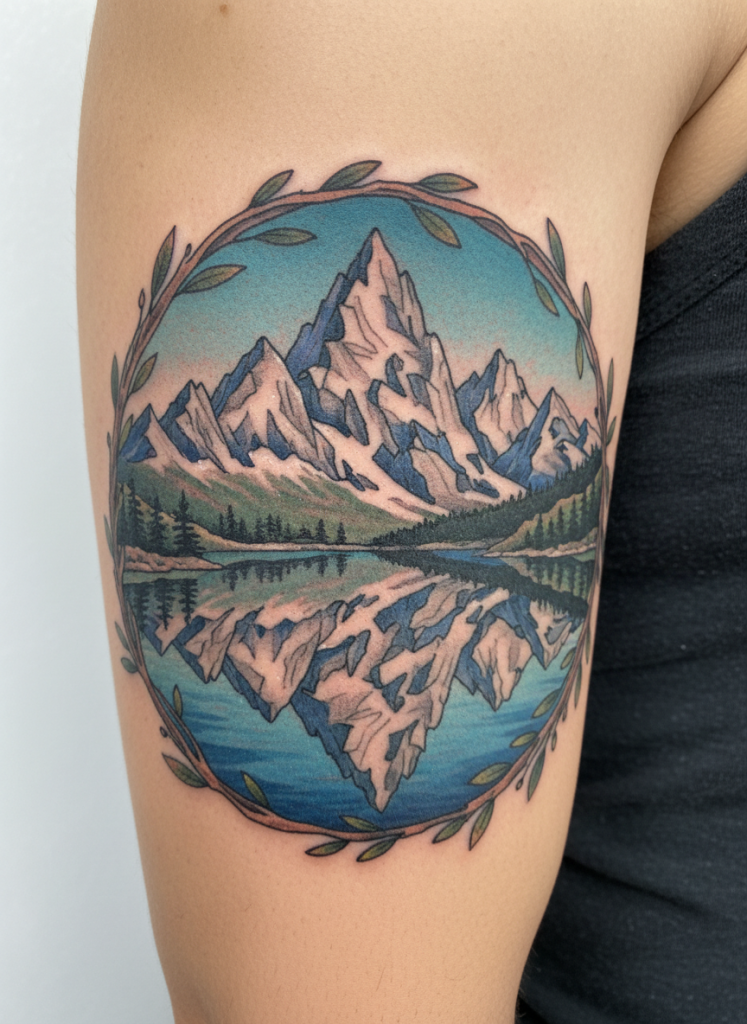 An alpine lake scene is all about symmetry and the perfect stillness of a mirror-like surface. The design typically features a sharp mountain range in the top half, with its exact reflection mirrored in the clear water below. This creates a balanced and harmonious composition that is very pleasing to the eye. It symbolizes clarity, self-reflection, and the ability to find a moment of total calm in a busy world. To make the reflection feel authentic, the artist uses slightly softer lines and a bit of a ripple effect in the water, contrasting with the hard, jagged lines of the mountains above. This is a popular choice for center-back or sternum placements where the symmetry of the design can be fully appreciated, serving as a permanent reminder to keep your mind as clear and still as the mountain water.