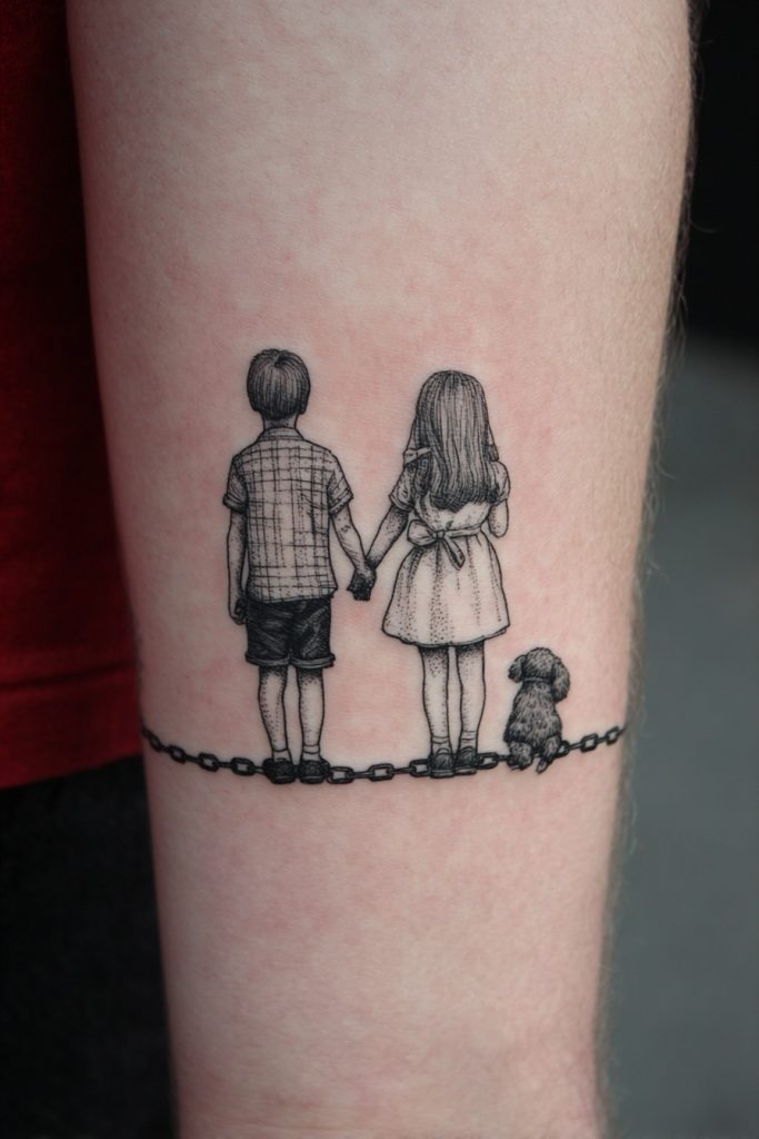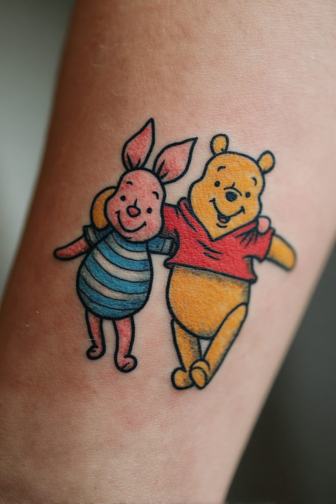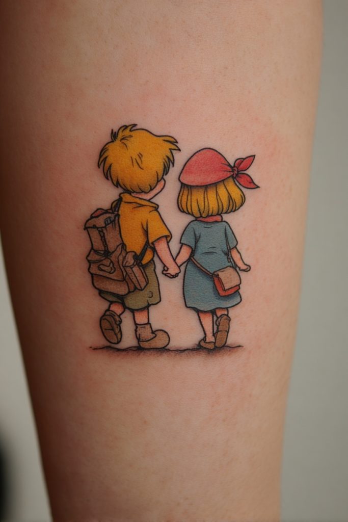 Tattooing a favorite character from a shared childhood cartoon or book is a wonderful way to preserve the magic of your early years. Whether it is a pair of mischievous characters or a duo like Winnie the Pooh and Piglet, these tattoos evoke an immediate sense of nostalgia and joy. It is a celebration of the hours you spent playing together and the stories that shaped your young imaginations. This choice is often colorful and vibrant, serving as a constant reminder to never lose the sense of wonder and fun that defined your childhood. It connects you to a simpler time and honors the person who was your very first playmate and partner in crime, keeping those cherished memories close at hand.