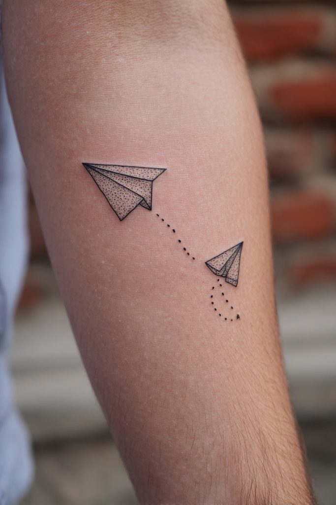 A paper airplane is a nostalgic symbol of the simplicity of childhood and the shared adventures you embarked on as children. It represents the idea of taking flight and exploring the world, while the folded paper suggests the fragile yet enduring nature of your early years together. Many brothers and sisters choose to have a small airplane with a dotted trail that leads to the other person’s tattoo, creating a visual connection when they are near. It is a playful and lighthearted choice that captures the whimsy and freedom of being young and imaginative together. This design serves as a reminder to never lose the adventurous spirit you shared while playing in the backyard or dreaming of the future, keeping that sense of childhood wonder alive.