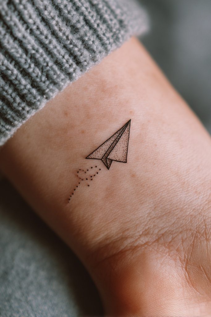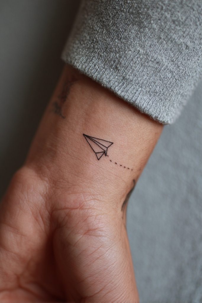 The paper plane is a whimsical and charming symbol of youth, travel, and the simple joy of letting go. It represents the idea of casting your dreams out into the wind and trusting where they might land, making it a favorite for the adventurous at heart. On the wrist, a tiny paper plane in a simple outline or dotwork style feels light and airy, as if it is about to take flight from your skin at any moment. It is a celebration of the journey rather than the destination, encouraging the wearer to maintain a sense of playfulness and curiosity about what lies ahead. This tattoo is a lovely way to keep the spirit of exploration alive, no matter how grounded your daily routine might be.