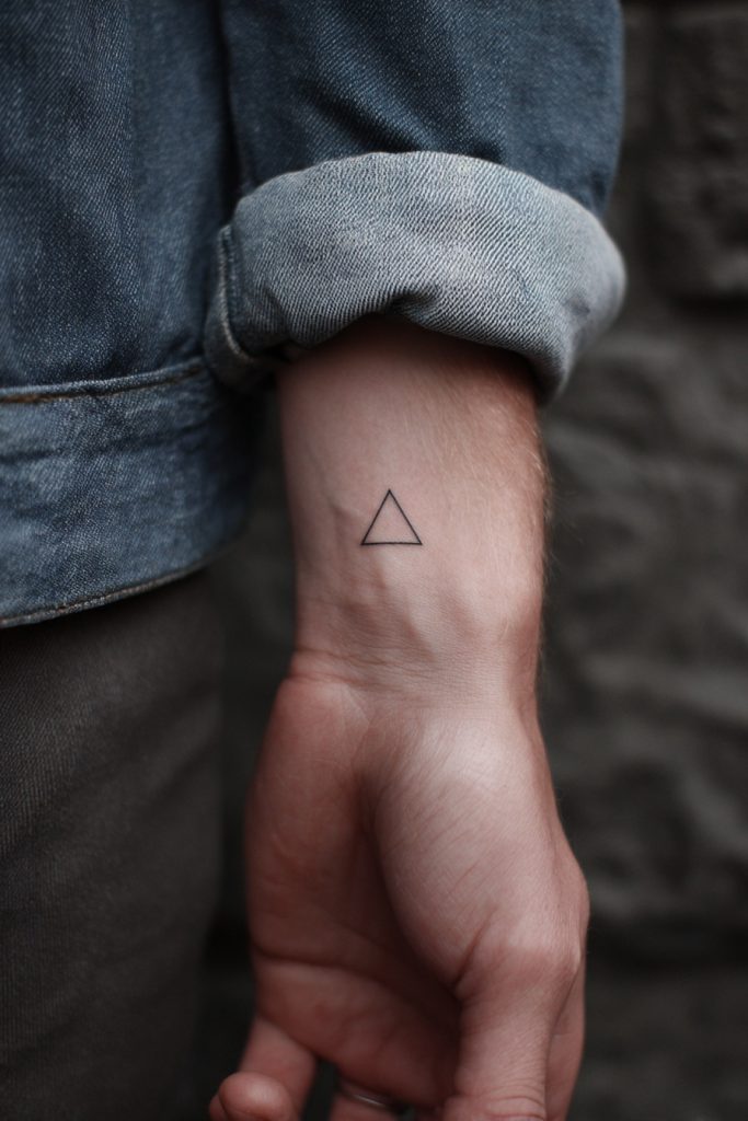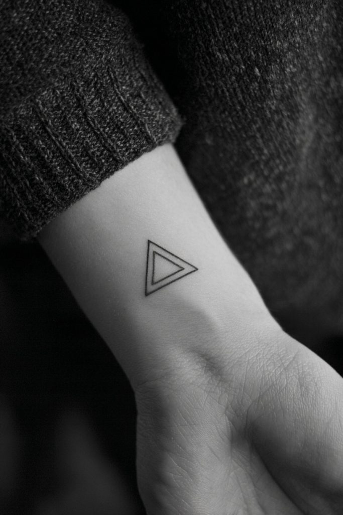 Triangles are powerful symbols in geometry and spirituality, often representing the number three, balance, or the union of mind, body, and spirit. An open triangle on the wrist is a sleek and contemporary choice that appeals to those who appreciate clean lines and architectural shapes. Depending on which way the point is facing, it can symbolize different things, upward for fire and ambition, or downward for water and grace. The simplicity of the shape allows it to remain a mystery to others while holding deep personal significance for you. It is a sharp, intellectual design that looks particularly striking on the inner wrist, where it can be easily hidden or shown off depending on your mood.