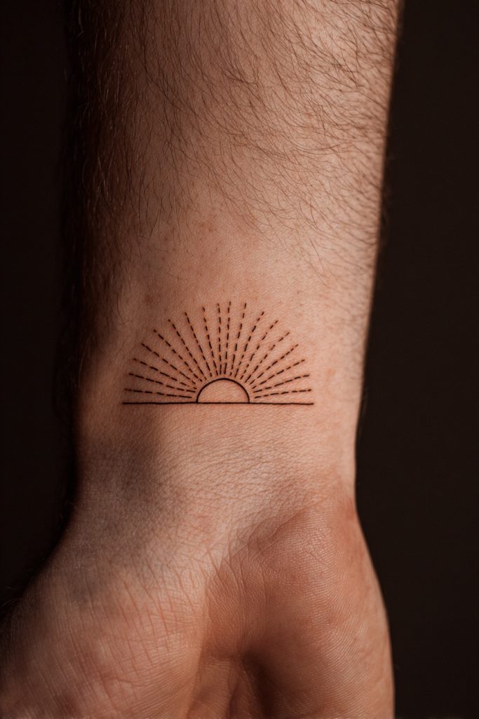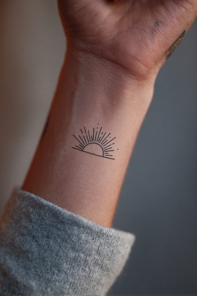 The rising sun is a universal symbol of hope, new beginnings, and the endless possibilities that each day brings. When simplified into a semi-circle with a few radiating lines, it becomes a powerful and uplifting icon that fits perfectly on the wrist. This design is for the optimist who believes that no matter how dark the night, the light will always find its way back. It is a small but mighty reminder to keep pushing forward and to embrace the fresh start that every morning offers. The sun’s rays can be tattooed as very fine lines, giving the piece a delicate and glowing appearance that feels both warm and inspiring against the skin.