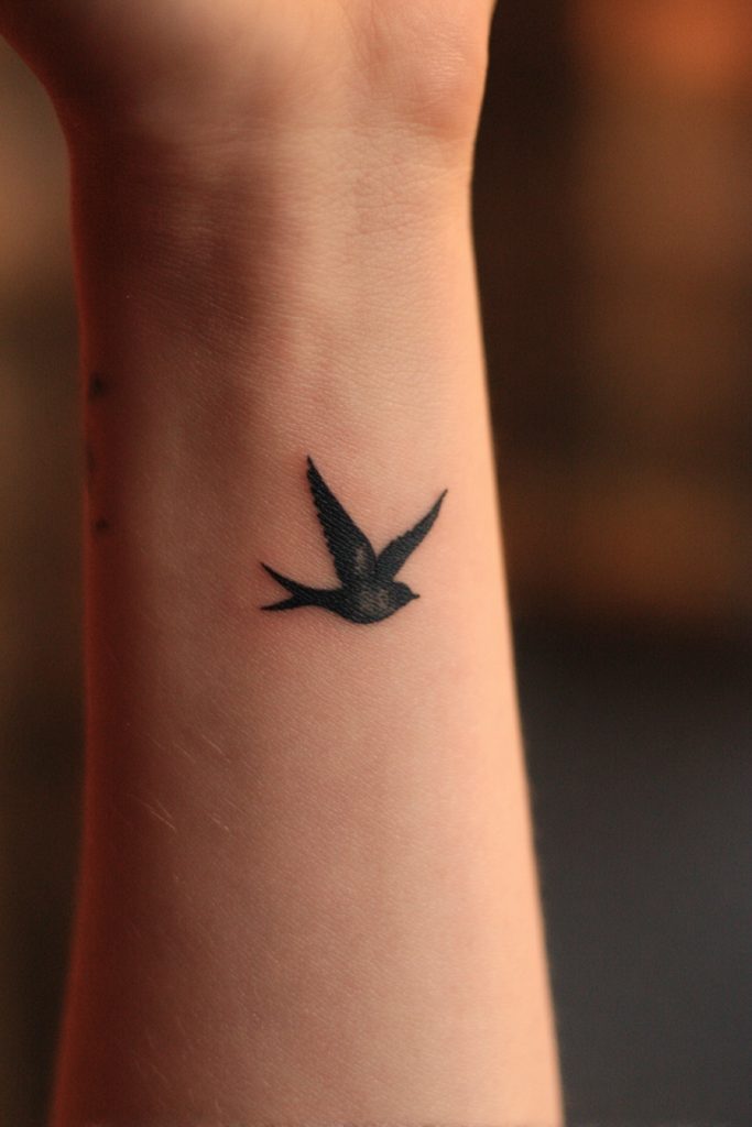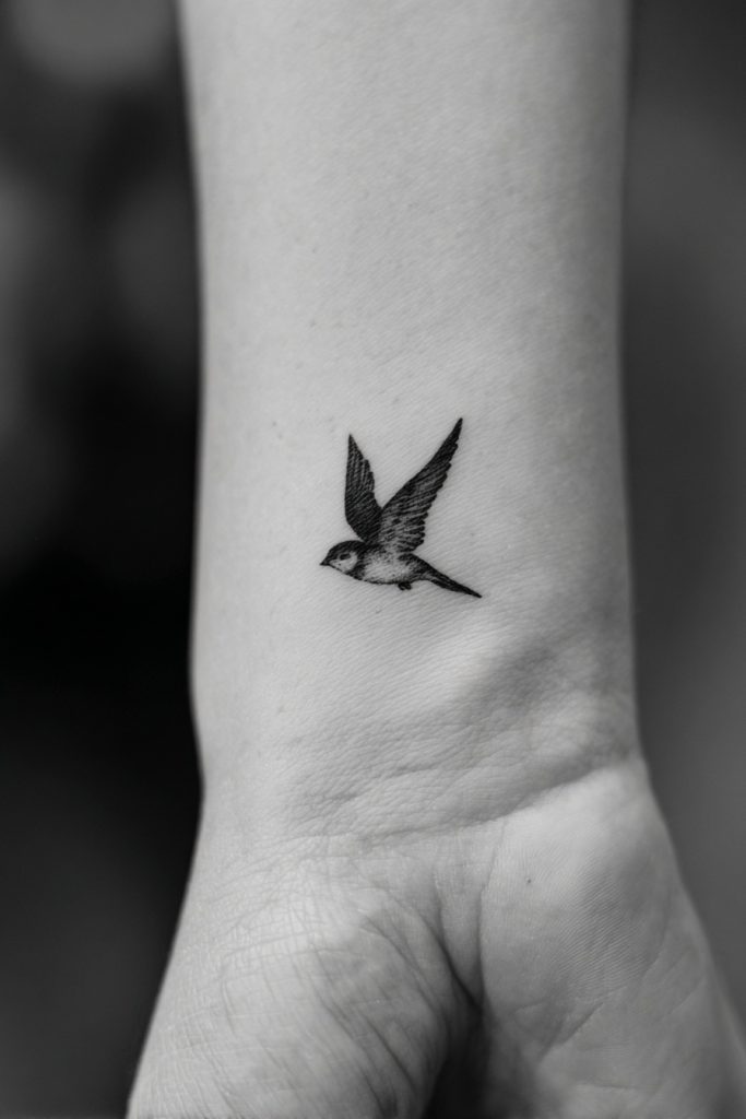 A single bird in flight is a timeless representation of freedom, perspective, and the ability to rise above the challenges of the earth. When tattooed on the wrist, a tiny silhouette of a swallow or a sparrow can act as a reminder to keep your spirit light and your eyes on the horizon. The movement captured in the wings gives the tattoo a sense of life and energy, making it feel as if the bird is soaring along your arm. It is a favorite for those who value their independence and the ability to navigate the world on their own terms. This small icon serves as a permanent wingspan for your soul, encouraging you to always seek out the highest vantage point in any situation.