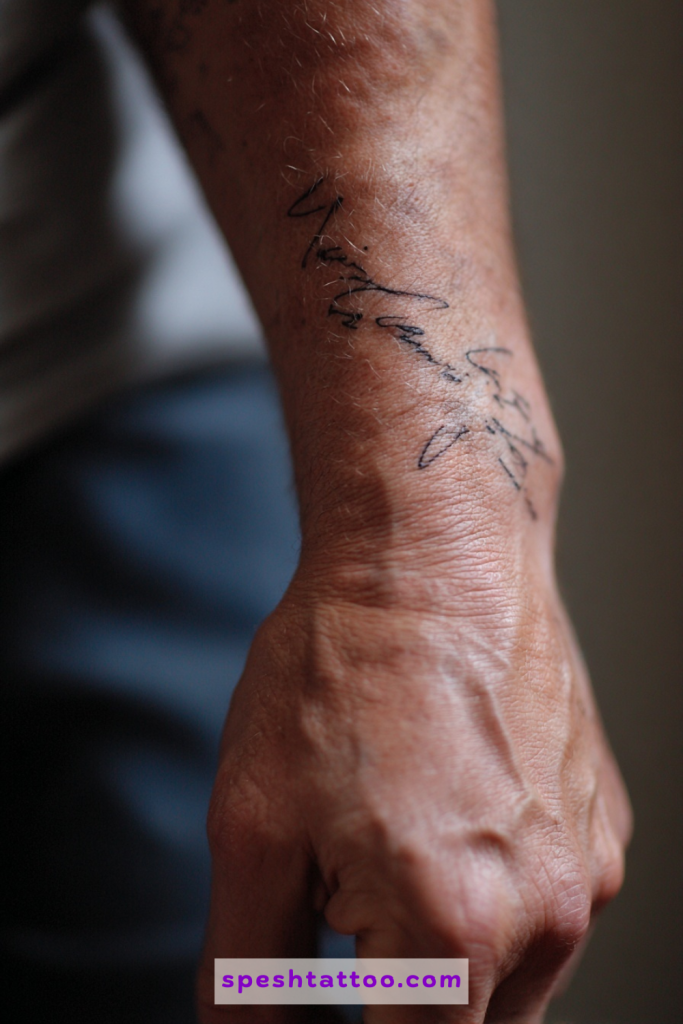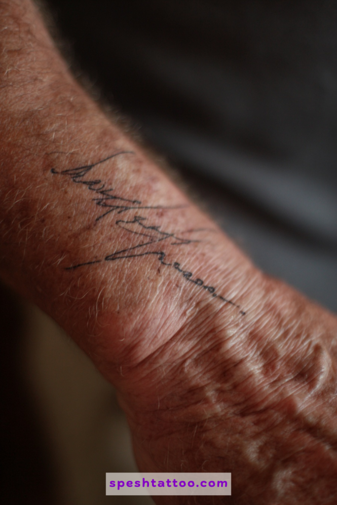 There is a profound and haunting beauty in seeing the actual handwriting of a parent, grandparent, or child etched permanently into your skin. This style of tattoo involves taking a signature from a legal document, a birthday card, or a handwritten note and having a skilled artist replicate the exact pressure and flow of the original pen strokes. For men honoring a family member who has passed, this provides a tactile and literal piece of that person that remains with them forever. The imperfections in the writing, the slight shake of an elderly hand or the exuberant loops of a child’s first letters, add a layer of raw emotion that a standard computer font can never achieve. It is an honest, unvarnished tribute to the unique identity of the individual.