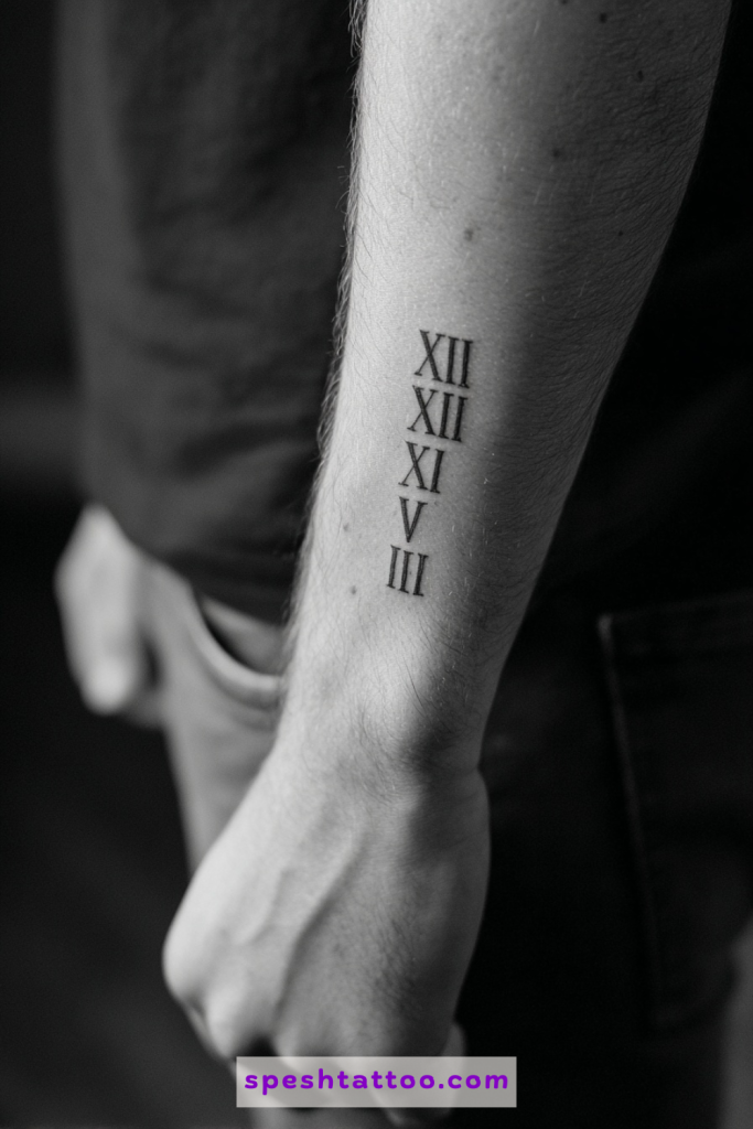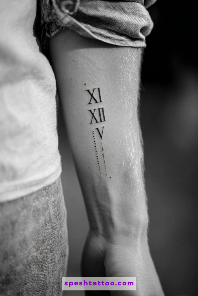 Roman numerals offer a structured, geometric, and timeless way to commemorate important family dates such as birthdays or anniversaries. The bold, vertical lines of the numerals provide a masculine and architectural feel that looks excellent as a standalone piece or integrated into a larger sleeve. You might choose to stack the dates of all your children along your spine or place a single, significant date across your collarbone. The lack of curved lines makes this style very clear and easy to read, ensuring that the significance of the date is never lost. It turns a personal milestone into a historical landmark, giving the event a sense of permanence and gravitas that feels carved in stone rather than just inked on skin.