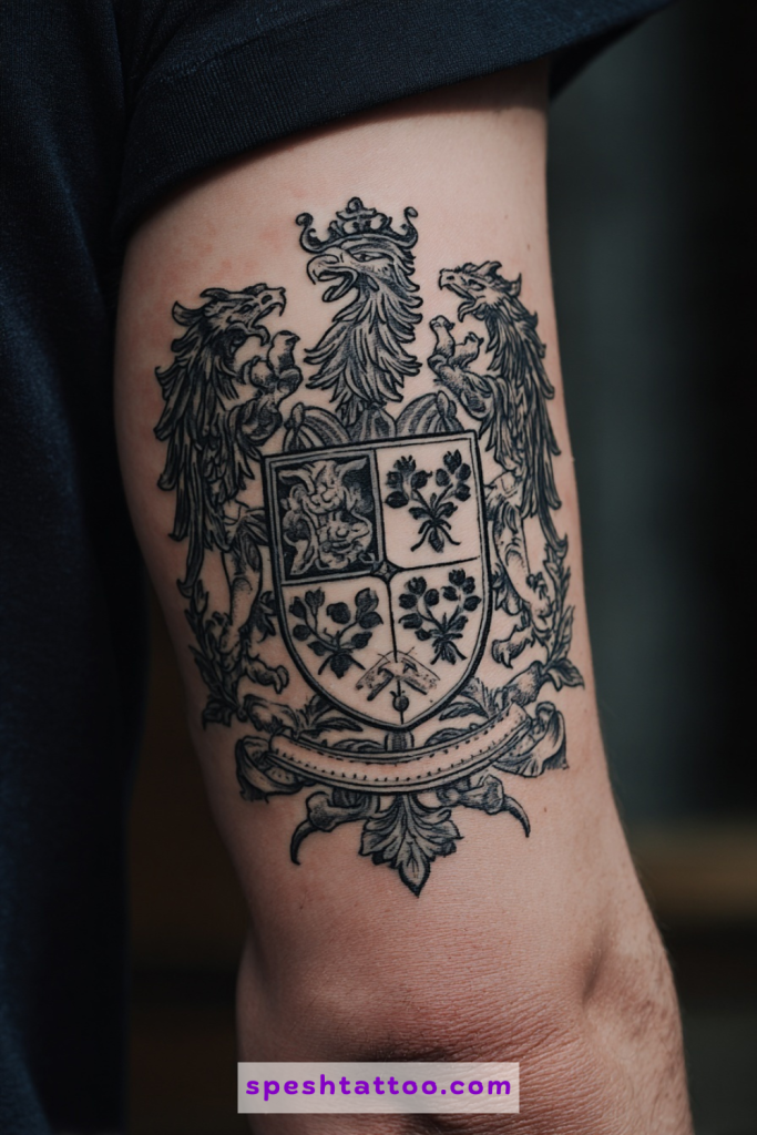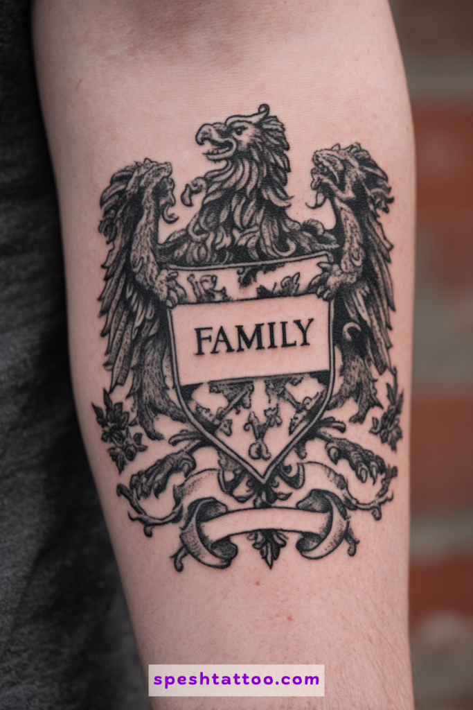 If you have a strong connection to your family history and heritage, a tattoo of a traditional family crest or coat of arms is a noble way to honor your lineage. This style usually features bold blackwork, heraldic animals like lions or eagles, and symbolic elements that represent the virtues and achievements of your ancestors. Placing the family surname on a banner beneath the shield grounds the design and makes it a proud statement of identity. These tattoos work best on the upper arm or the back, where the large-scale details can be fully appreciated. It is a high-impact design that celebrates the idea that you are a temporary guardian of a name and a history that stretches back through many generations.