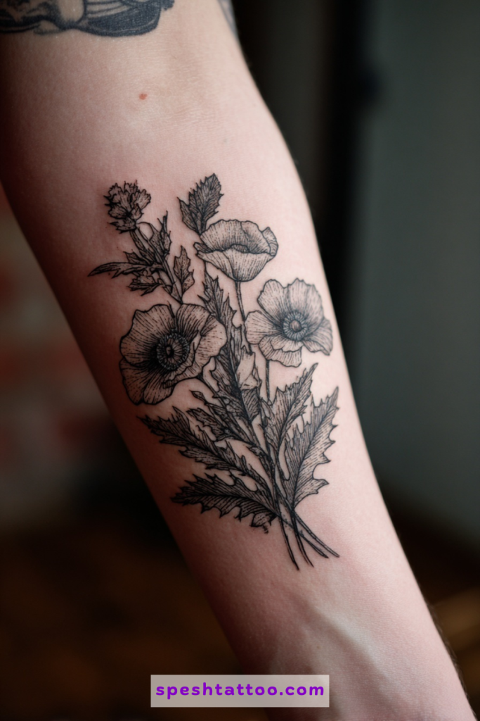 While flowers are often seen as feminine, many modern tattoo designs incorporate birth-month flora in a way that feels rugged and artistic. By using woodcut, etching, or dark illustrative styles, an artist can create a bouquet that represents each member of the family while maintaining a masculine edge. For example, a sharp, detailed thistle for a January birth or a bold, shaded poppy for August can be woven together with brambles or geometric lines. This is a subtle and highly artistic way to represent your family without using names or dates. It invites curiosity and allows you to share the meaning behind the different elements only when you choose, making it a very personal and multi-layered tribute.
